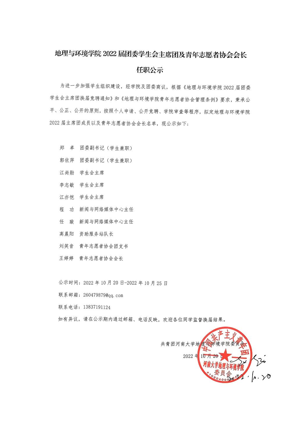 【公  示】球探足球比分网 2022届团委学生会主席团及青年志愿者协会会长任职公示