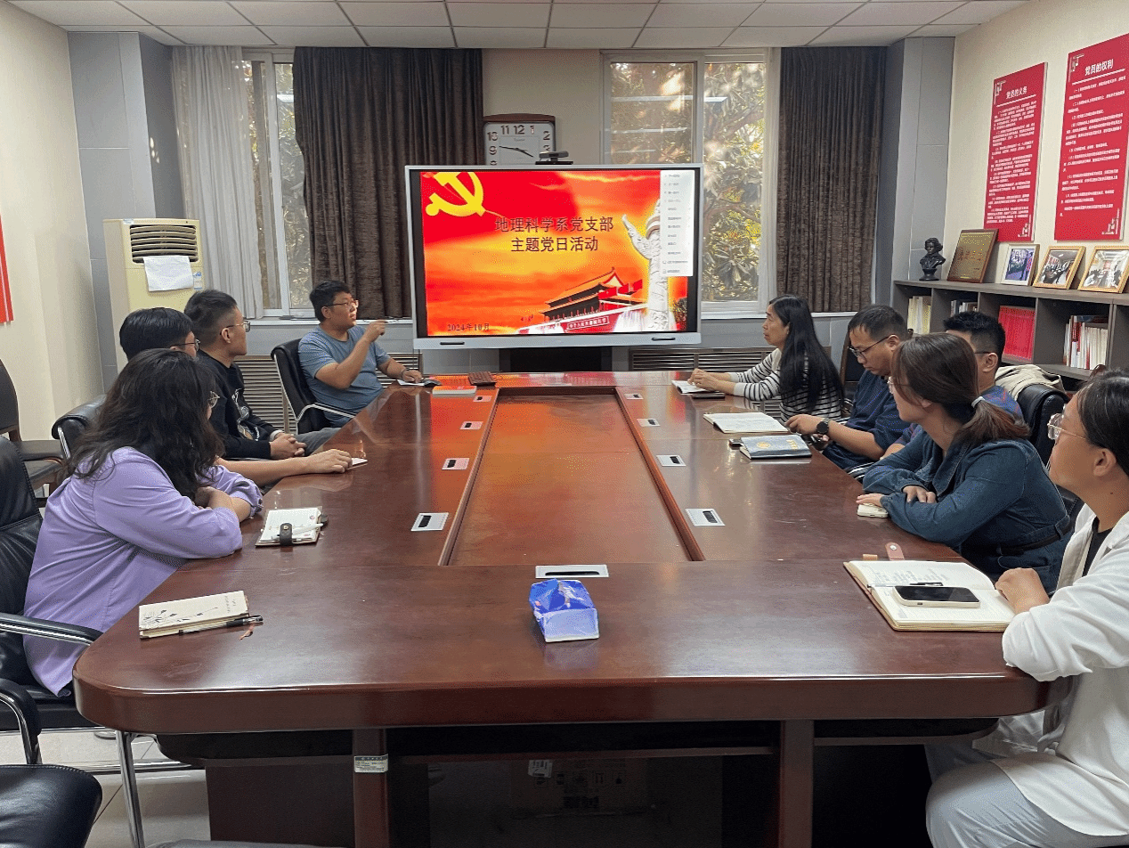 根据河南大学学习贯彻党的二十届三中全会精神省委宣讲团报告会会议精神,深入学习贯彻党的二十届三中全会精神,提高支部全体党员的党性修养,地理科学系党支部于10月10日下午在地学楼二楼党支部书记活动室召开了主题党日活动。活动由地理科学系党支部书记李开封主持,支部全体党员参加。