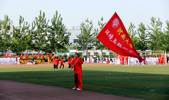 我院上场顺序排第7位。随着裁判员的一声令下,我院舞蹈队的成员们闪亮登场,为大家带来了一场别开生面的开场舞。她们衣着红装,手执红扇,配合着悠扬灵动的音乐,尽展婀娜舞姿。舞蹈一结束,铿锵有力的入场音乐响起,旗手与太极队伍迎面奔跑,气势恢宏,队员们迅速到位,精神抖擞。待太极拳音乐响起,队员们和着音乐“起势”,他们不紧不慢地伸出双手、迈步、连贯而不失节奏地开始表演孙氏太极拳,尽展其刚柔兼并之道;参赛成员服装统一,队形整齐,动作规范,协调连贯,凸显了中华太极文化的博大精深。在比赛中,我院所有参赛队员们动作娴熟,专注认真,极具创意的表演赢得了现场老师及同学的掌声。