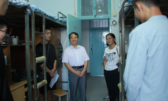 院长秦耀辰、党委书记闫峻一行深入南苑、华源学生宿舍,与新生进行亲切交谈。秦耀辰亲切询问了外省同学对新环境的适应,他表示,很多学生是初次离开家乡,来到陌生的城市,面对一个新的圈子,大家要积极融入,要学会照顾自己,提高独立生活的能力。闫峻提醒大家要提高自我保护意识和警觉意识,要注意宿舍的安全问题,妥善保管自己的贵重物品,同学之间要相互关爱、互帮互助。对想家的学生更是关怀备至,找来同乡的学生与其交流,并鼓励学生要学会自立。