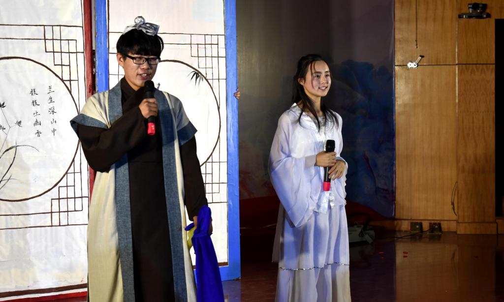 伴随着激情四射的开场舞,晚会拉开了序幕,动感十足的饶舌说唱《R!ch》和乐队演出带动了全场的气氛;小品《四大才子》、《倩女幽魂》带来的反串夸张生动,令人捧腹大笑;惊艳的古典舞、帅气的歌伴舞和男女对唱将观众带入了浪漫的情境;创意T台秀《博物馆奇妙夜》带领观众经历了一场穿越千年的旅行;本场晚会不仅有爆笑如雷的小品、活力四射的现代歌舞,更有古典话剧《梁祝》重现中国古代凄美的爱情故事,梁祝坚贞不渝双双化蝶撼动人心,触动观众泪点。戏曲舞《霸王别姬》,伴着婉转悠扬的音乐,舞者绛唇珠袖,一舞动四方,惊艳全场。使观众们深深地感受到了中国古典文化之美。本次晚会期间还穿插了节目互动的环节,同学们以微信留言、微信抽奖以及游戏互动等形式参与其中,赢得了许多精美的奖品,也使得现场气氛更加活跃。最后伴随着酷炫的光影秀表演,晚会落下帷幕。