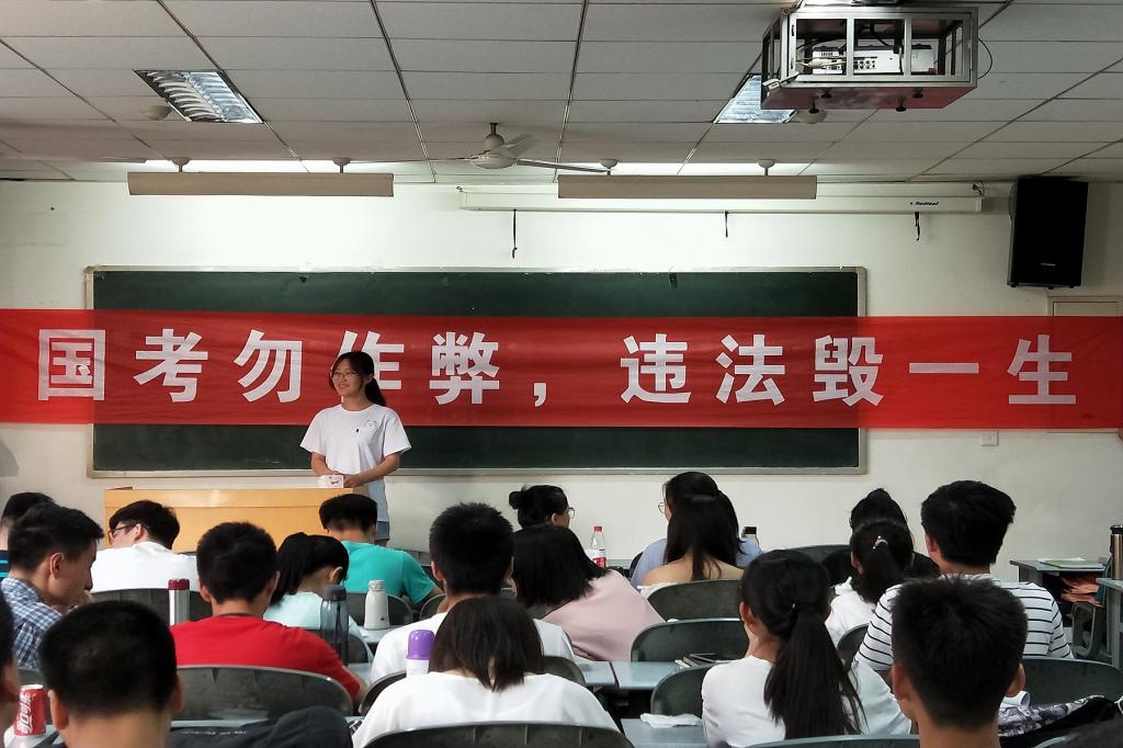 6月4日,为响应河南大学严抓高考替考现象的工作安排,我院2017级全体同学召开了以“国考勿作弊,违法毁一生”主题班会。会议对同学们进行了诚信思想教育,强调了高考替考的严重后果,告诫同学们一定要坚决杜绝高考替考现象。
