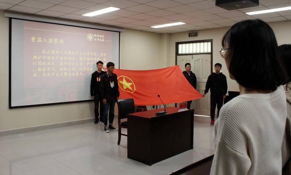 随后,徐小军书记就纪念五四运动一百周年和庆祝新中国成立七十周年两个活动进行主题报告,通过对历史的回顾反思,进一步地阐释了五四精神“爱国、进步、民主、科学”,和坚决维护国家利益的当代爱国主义精神,引发了青年学子们的共鸣。最后,大家重温了入团誓词,并咏唱共青团团歌。