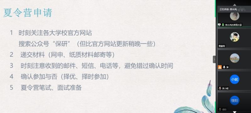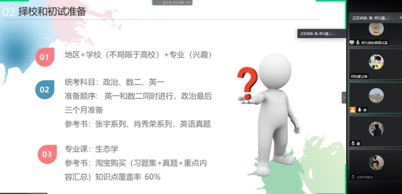 疫情阻挡了返回学校的脚步,却不能阻挡学习的脚步,不能阻挡时间流逝的脚步。此次考研经验交流会,使同学们对考研过程有了一个更具体、 更清晰的认识,为正在备考的同学提供宝贵的复习经验,同时也为尚且迷茫的同学们指引了正确方向。