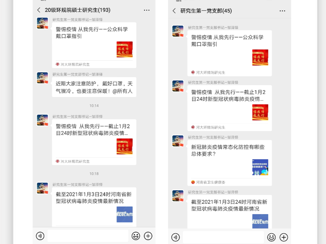 在注重同学们身体健康的同时,研究生第一党支部也提出,要及时关注学生的心理健康动态,筑牢学生心理健康安全防线。支部发布多篇工作通知、温馨提示,提醒学生强防护、不恐慌、信科学、不传谣,增强广大学生的思想认同、防护意识和必胜信心,将防疫与思政育人相结合,引导学生坚定理想信念,担当抗疫宣传员,共同汇聚疫情科学防控宣传的正能量。