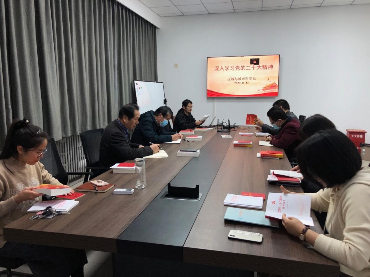 人文地理与城乡规划专业建设目标、推进路径和人才引进等方面进行工作部署,指出系室要以二十大精神为引领,百尺竿头、更进一步,助力一流专业建设;最后,党员代表高建华、秦明周围绕学习二十大报告、红旗渠精神谈了自己的看法,认为以后要进一步系统学习理论、进一步加强教学过程融入、进一步结合科研解读、进一步强化实践学习,以达到知行合一式的贯彻落实。