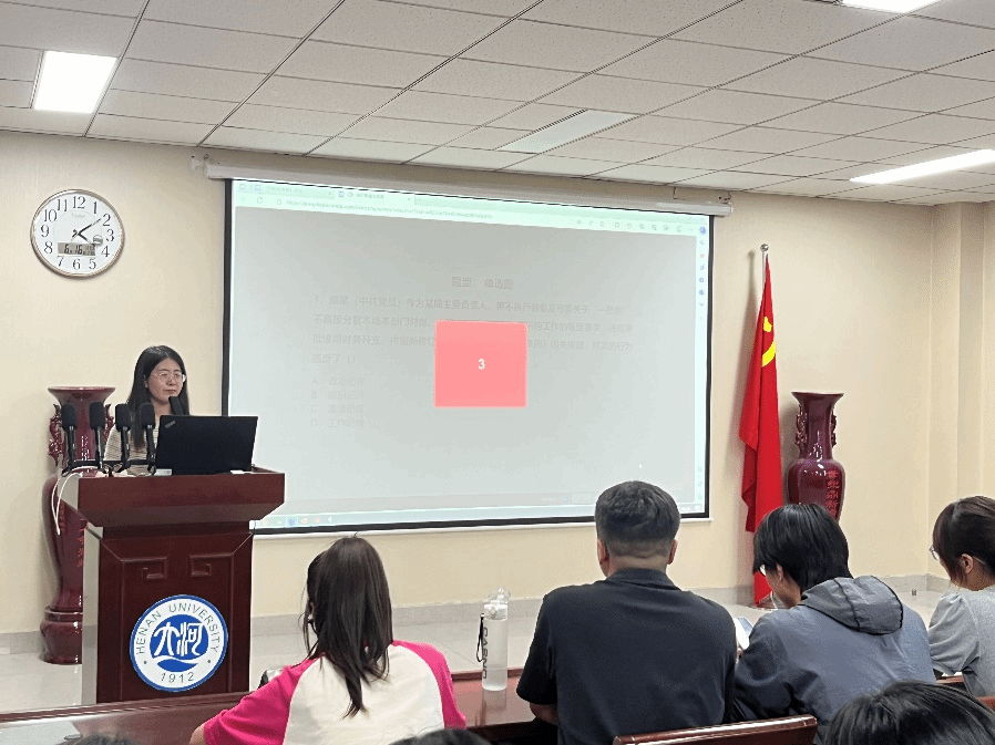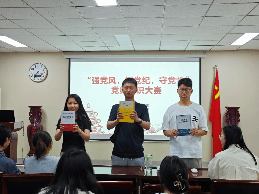 党课结束后,广大党员根据集中学习和个人学习的内容,开展党纪知识竞赛。竞赛采用抢答模式,题目内容以新修订的《条例》为主,分为单选题、多选题、判断题、填空题和简答题五部分,各党员代表队踊跃答题,现场气氛热烈,展现了各党员扎实的理论功底、良好的综合素质、向上的精神风貌。最后,由支委会成员计算各队伍得分,经过激烈角逐,研究生第四党支部第四队、研究生第一党支部第一队、研究生第一党支部第三队斩获前三名。