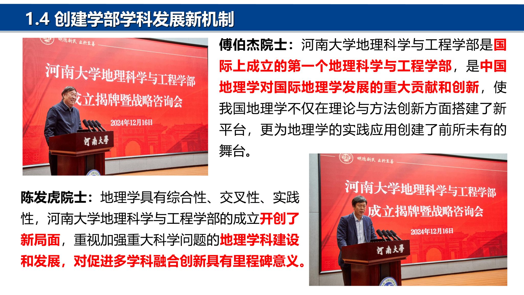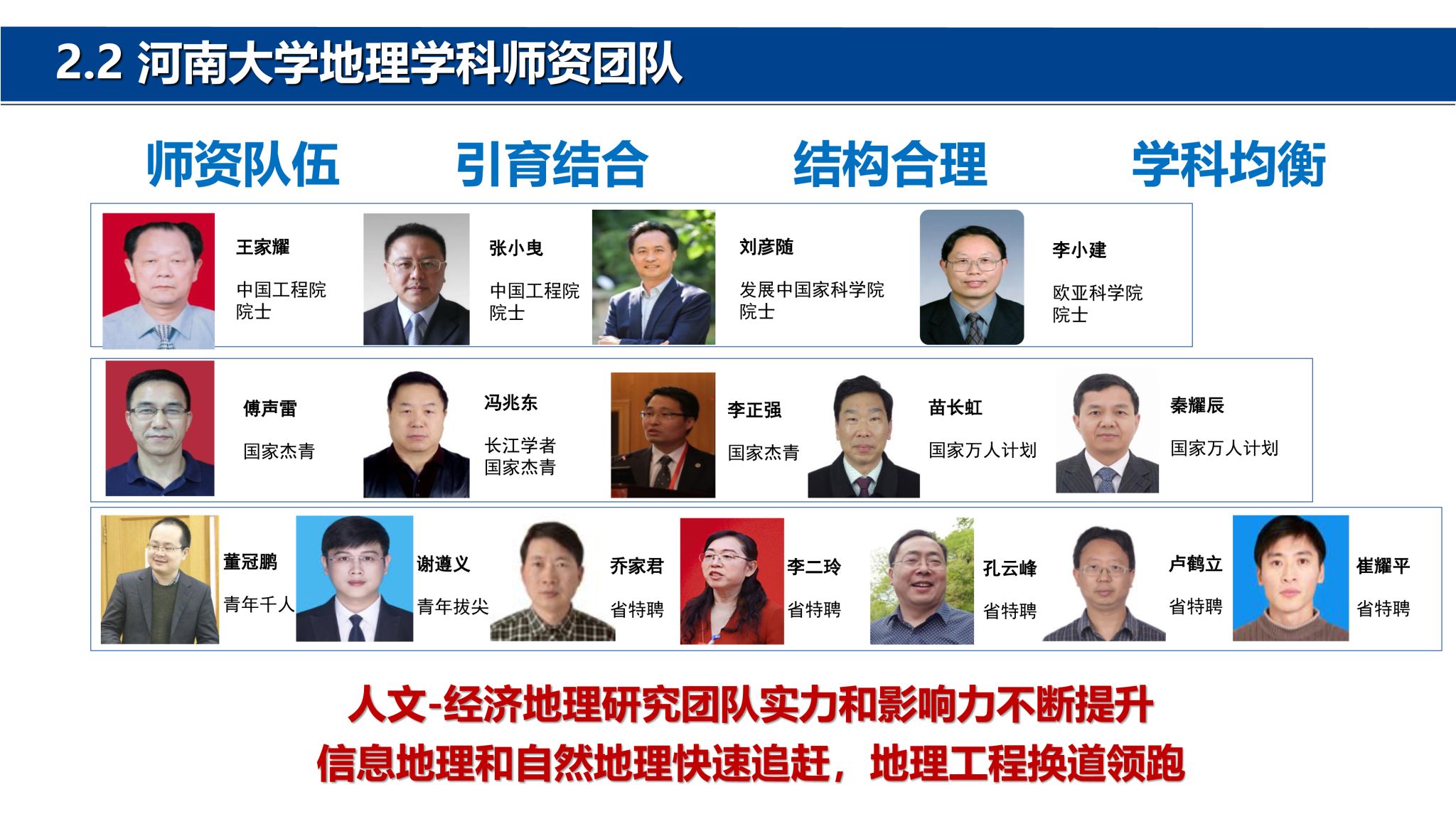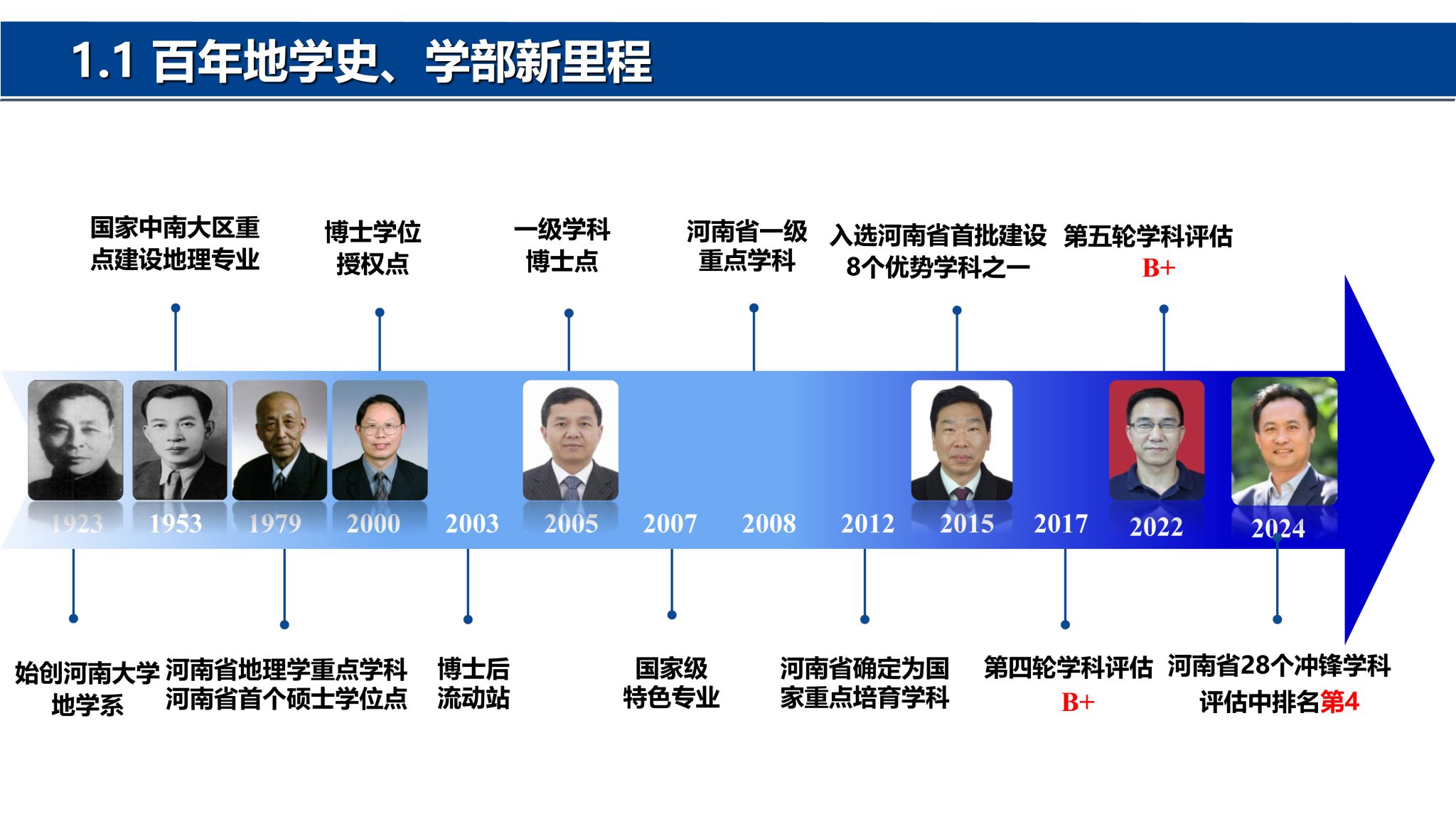 院士)冯景兰教授。经过几代地理人的筚路蓝缕、奋力拼搏,地理科学与工程学部在教学科研、学科建设、人才培养、社会服务等方面取得了突出的成绩,得到社会各界一致赞誉。地理学科在国家第四、第五轮学科评估中为B+位次,2024年在河南省28个冲锋学科评估中排名第4。