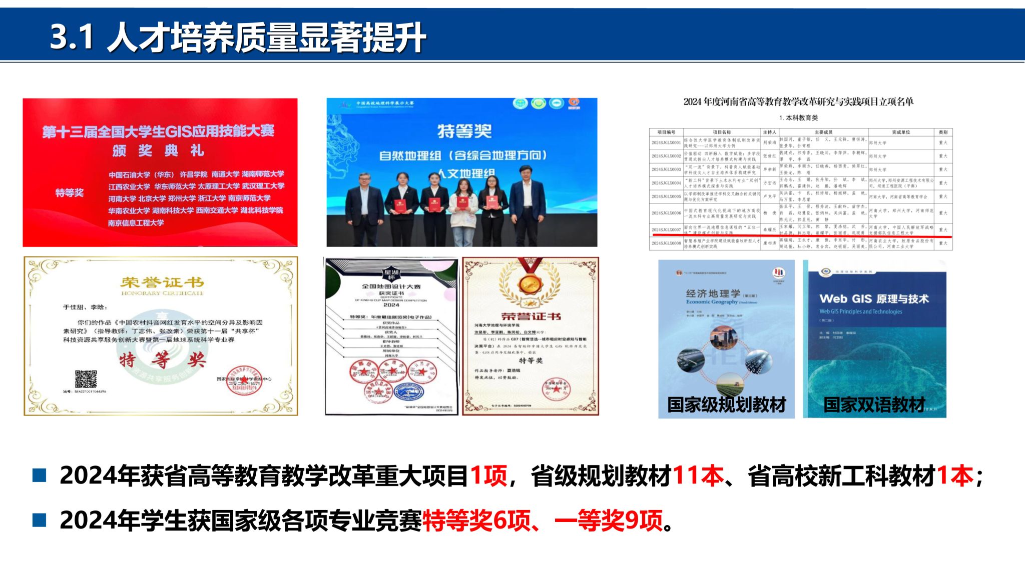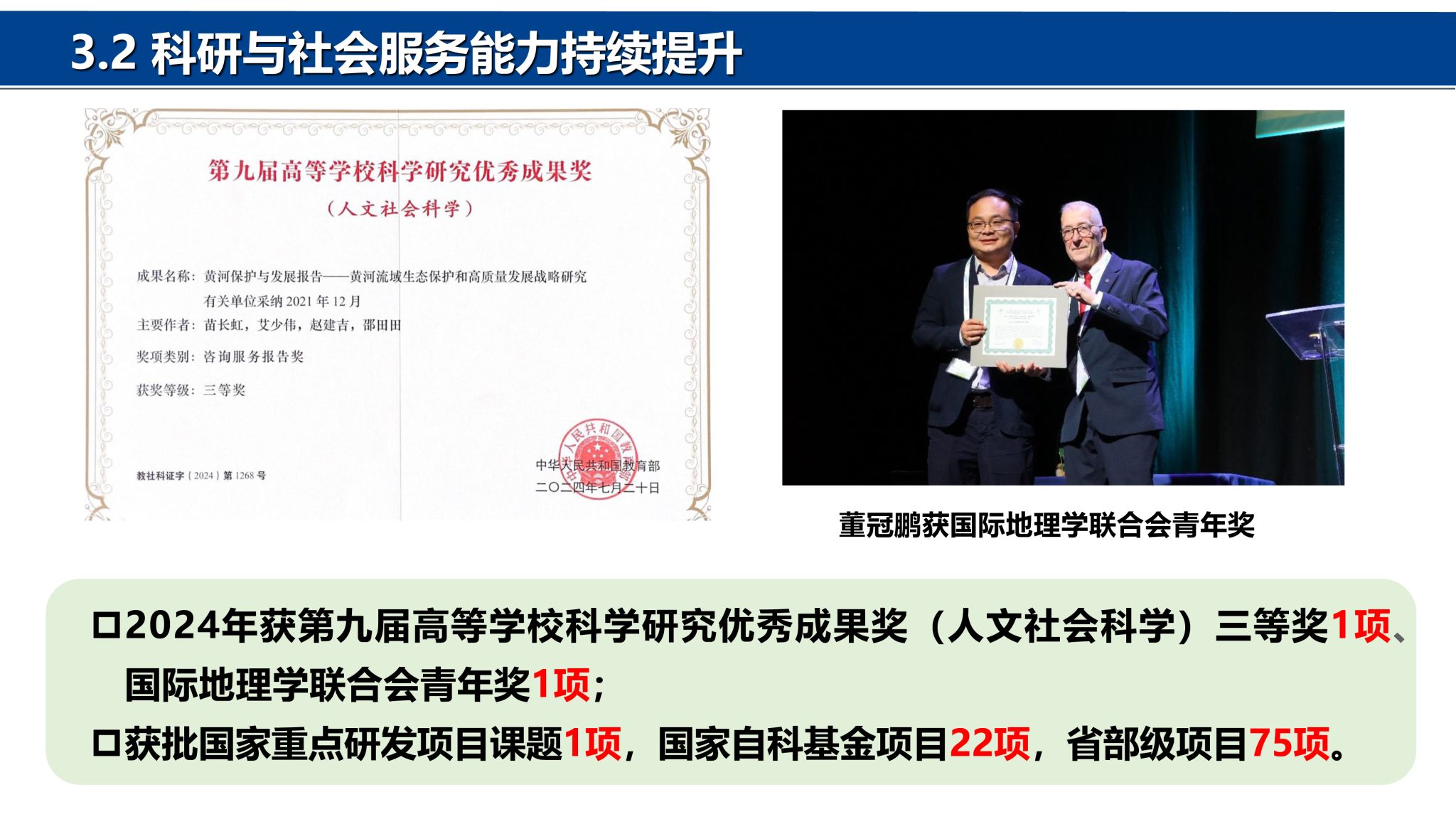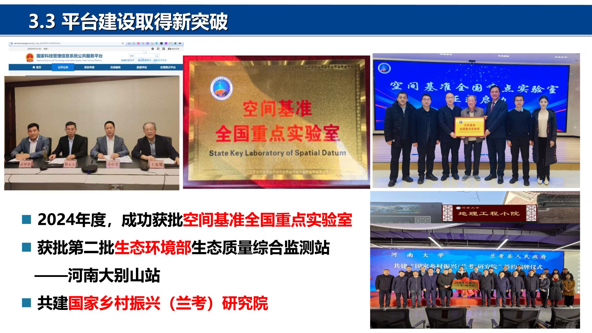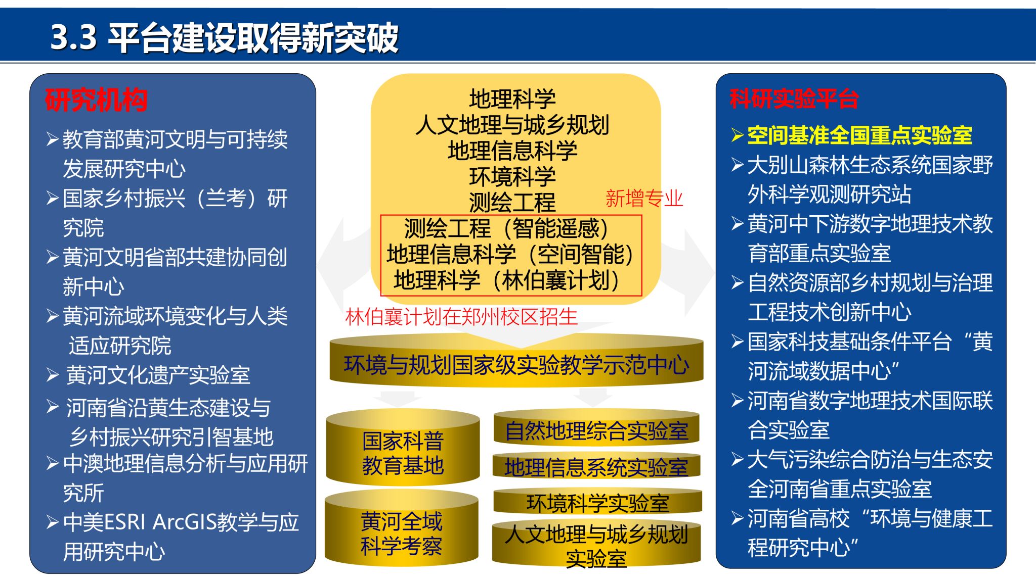 院士)冯景兰教授。经过几代地理人的筚路蓝缕、奋力拼搏,地理科学与工程学部在教学科研、学科建设、人才培养、社会服务等方面取得了突出的成绩,得到社会各界一致赞誉。地理学科在国家第四、第五轮学科评估中为B+位次,2024年在河南省28个冲锋学科评估中排名第4。