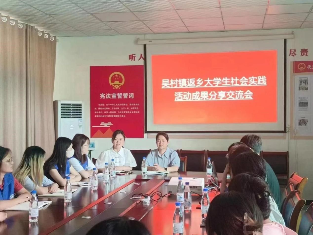 之后,一行人前往吴村镇柳湾村村委会,在此举行座谈交流会议。会议由王镇长主持,镇团委书记李静宜汇报了吴村镇团委工作开展情况,紧接着,由河南师范大学驻村工作队第一书记刘晨生解读村庄发展历程,分享柳湾村这样一个乡村振兴示范村的致富经验。随后,河南大学学生代表分享了参加社会实践活动的初衷、收获和建议。之后镇长孙意慧对大学生在吴村实践期间所作的贡献表示感谢,希望每位同学都能够通过此次实践活动感受乡村振兴的伟大成就,让更多的人了解吴村、走进吴村、融入吴村。