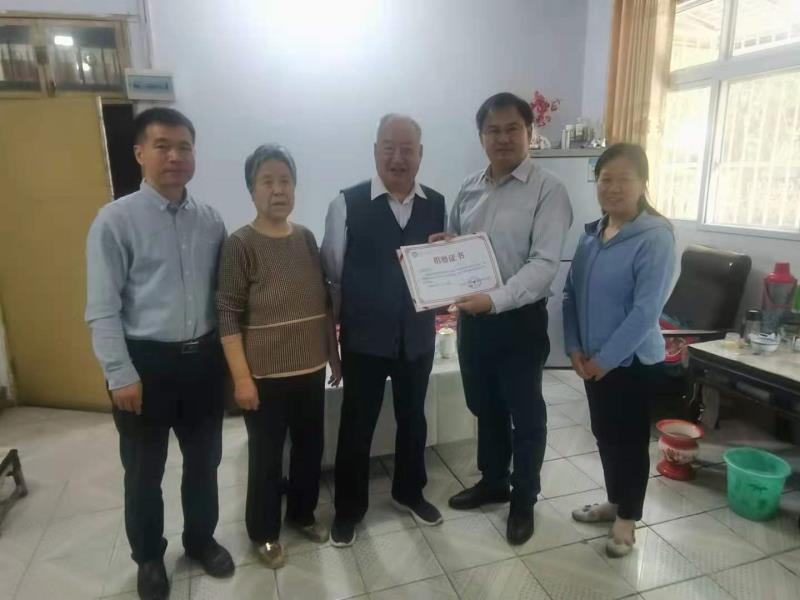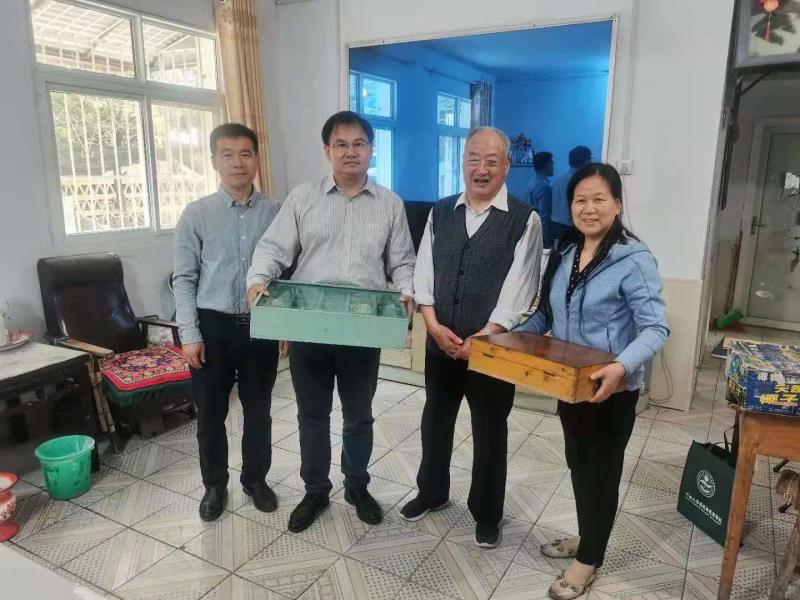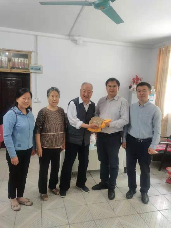 党委书记郑洪涛、副书记徐小军和党办主任王艾萍一行三人专程到已80岁高龄的63级校友方毓昌先生家中接受龟化石和矿石标本捐赠。