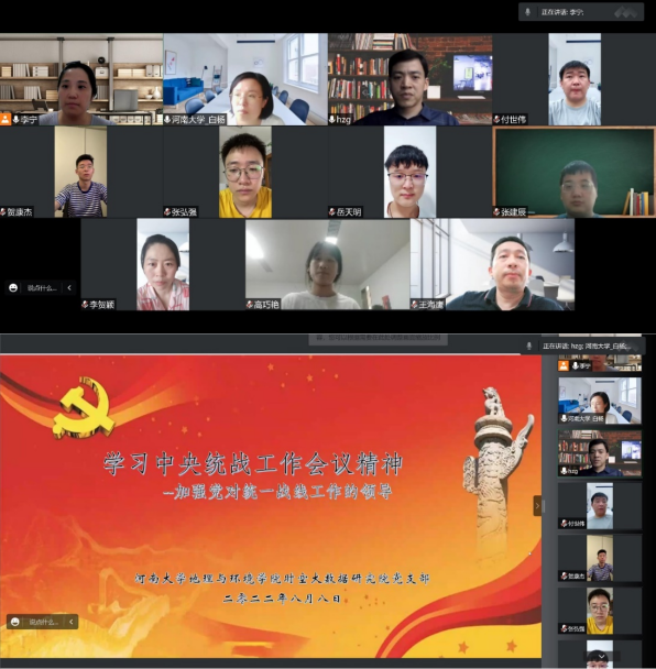 2022年8月8日下午,我院环境科学系党支部支委会组织本支部党员集中学习中央统战工作会议精神,考虑到正值暑假及当前的疫情形势集中学习通过线下+线上的形式进行,线下学习在地学楼506会议室进行,线上学习通过腾讯会议进行。支部党员通过观看视频、学习文件等多种形式深入学习领会中央统战工作会议精神。