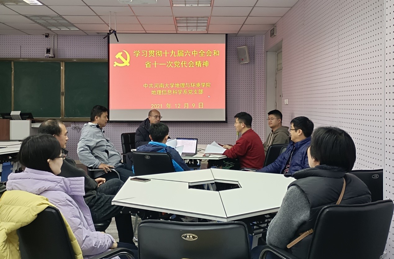 二楼微格教室召开支部大会,开展主题党日活动,传达学习党的十九届六中全会精神,研究贯彻落实工作。党支部书记、环境与规划国家级实验教学示范中心副主任闫卫阳,组织委员、地理信息科学系主任赵永,宣传委员兼纪检委员、地理信息科学系副主任宋宏权及全体党员参会。会议由闫卫阳主持。